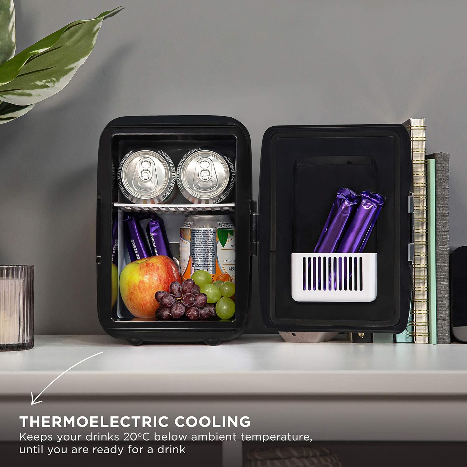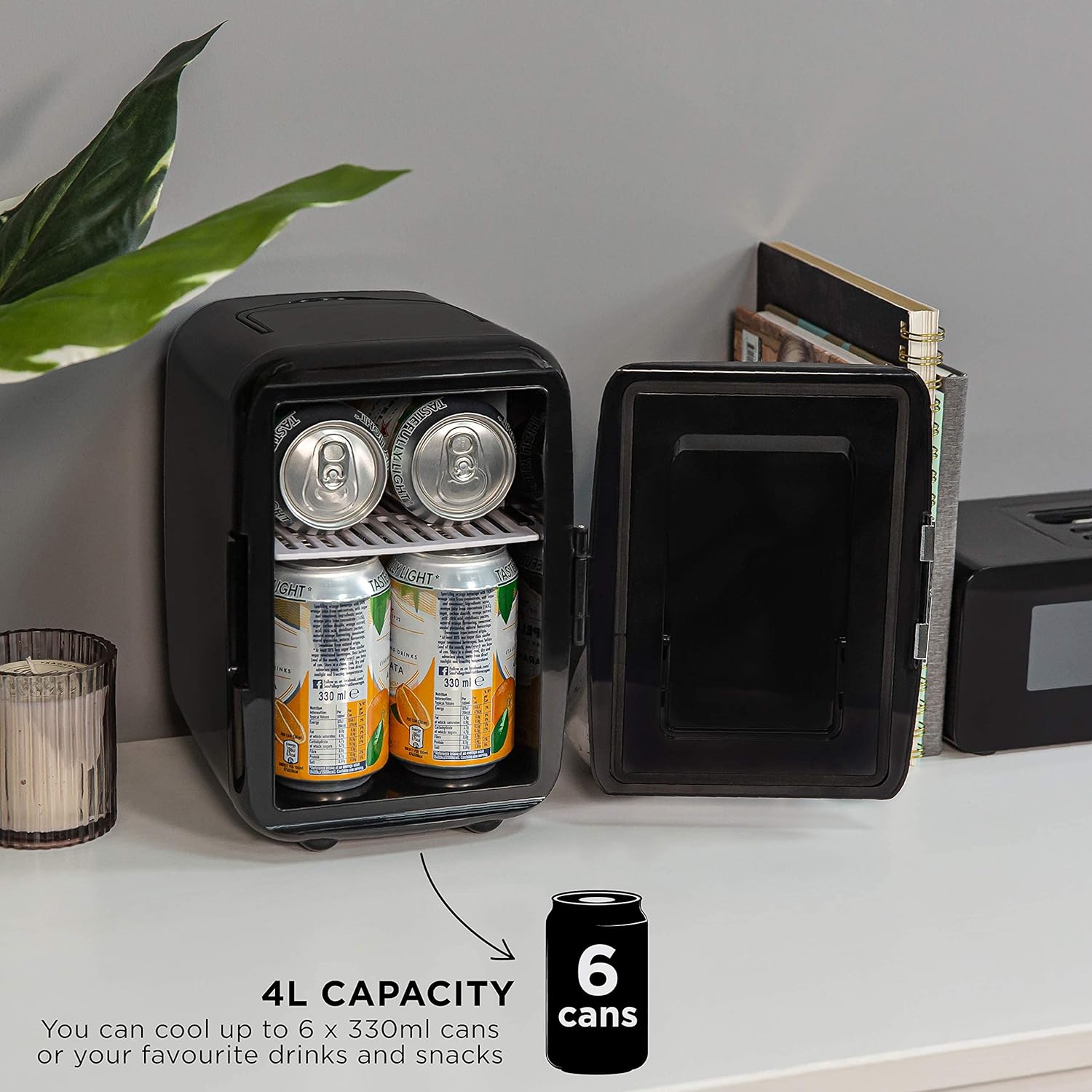 4L MINI COOLER – This mini compact cooler is ideal for a bedroom, office or countertop. There’s plenty of space to fit 6 x 330ml drink cans, or a few favourite snacks within handy reach.